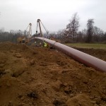 As we mentioned a few days ago, construction crews were pretty busy on our property over the past few weeks. Specifically, they were pulling a string of pipe about 500 feet long beneath the road just to the east of us. Our property was the staging area for this activity. And if it weren’t for some potentially frustrating line list violations, we kind of enjoyed watching the fascinating process and learning about it from the workers, a generally nice bunch of people. (For the record, we’ve spoken with more than 20 workers on our property. So far, we’ve met only 3 who are from Michigan. We don’t know whether that’s a representative sample, but it does cause one to be a little skeptical of all of Enbridge’s claims of creating lots of local jobs.)