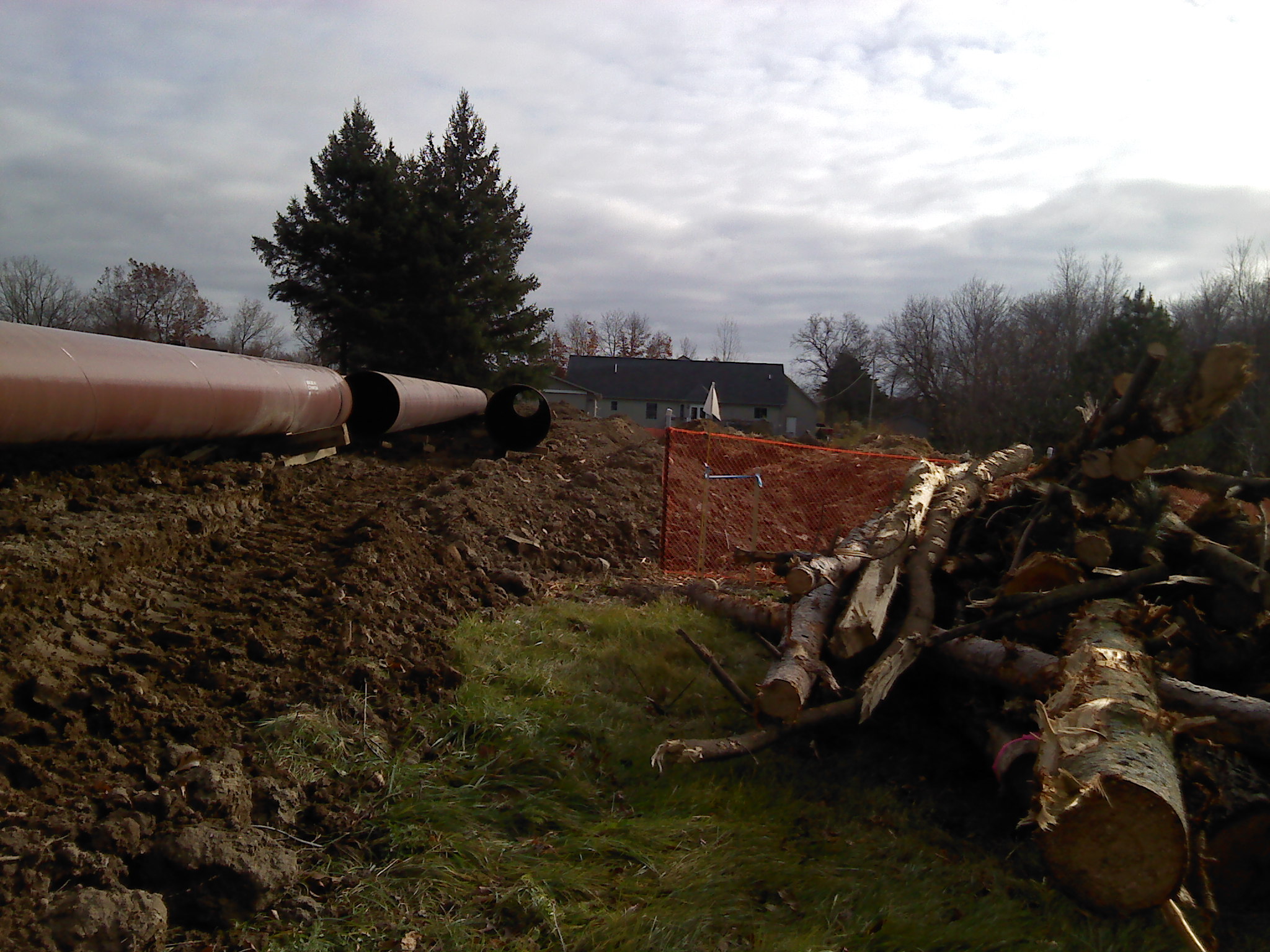 Under “Clearing and Site Preparation” the report says that “All brush and other materials cleared from upland areas within the construction corridor will be placed as a windrow along the construction corridor and disposed of as agreed to with the landowner.” In our case, what Enbridge agreed to is this (from our construction line list): “Trees with with pink ribbons are to be cut and saved for landowner at NE corner of property. Trees without ribbons are to be cut and hauled away.”
