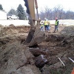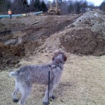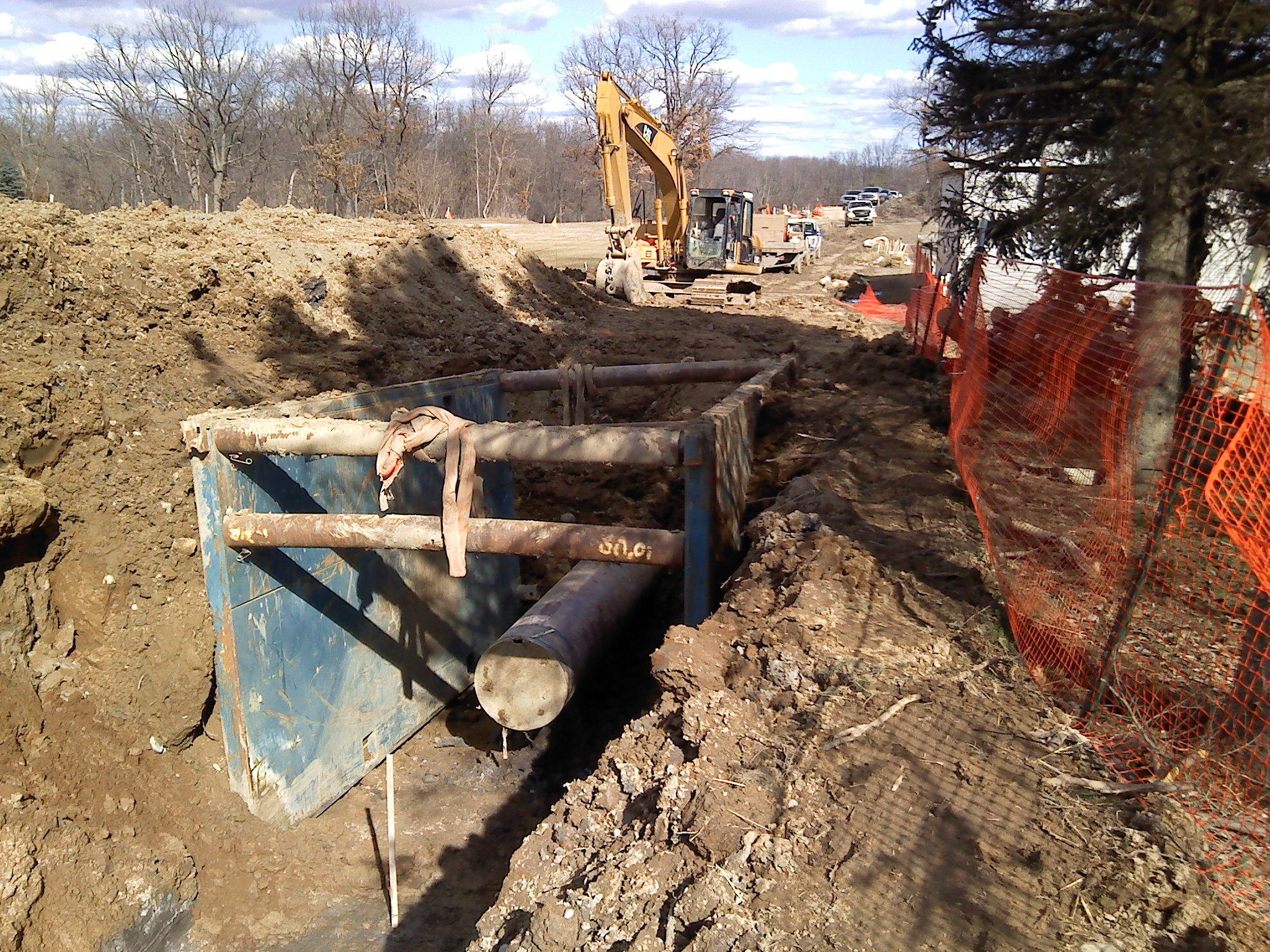 So where is this headed? Well, yesterday construction crews were hard at work on our property, finally putting the pipe in the ground. That means some serious excavation– the removal of lots and lots of subsoil. And in one place, where they will tie in to the pipe they bored underground several weeks ago, they had to install a big blue steel box because the slope of the trench walls are very steep. Here’s a look: