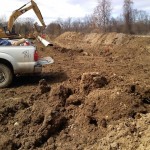 By now, we’re sure you know where this is going. All of that dirt (clay, really) they excavated to lay the pipe and install that big blue box had to be piled somewhere. Here they are piling it: