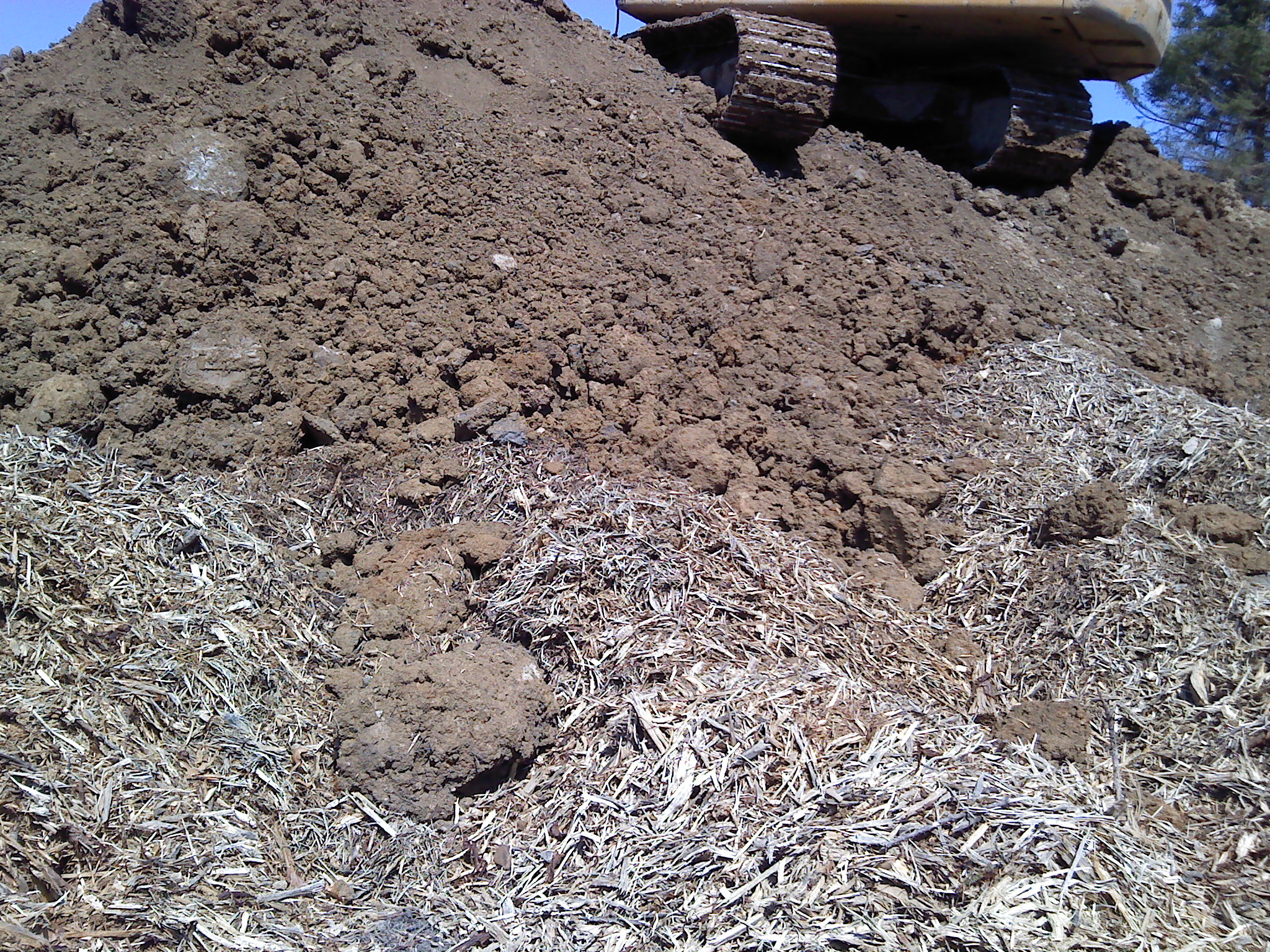 See where they put all that excavated subsoil? Yep, right on top of our topsoil and even spilling into and onto the shredded material. So much for segregation. Here is a shot from the same angle as the one of the topsoil above: