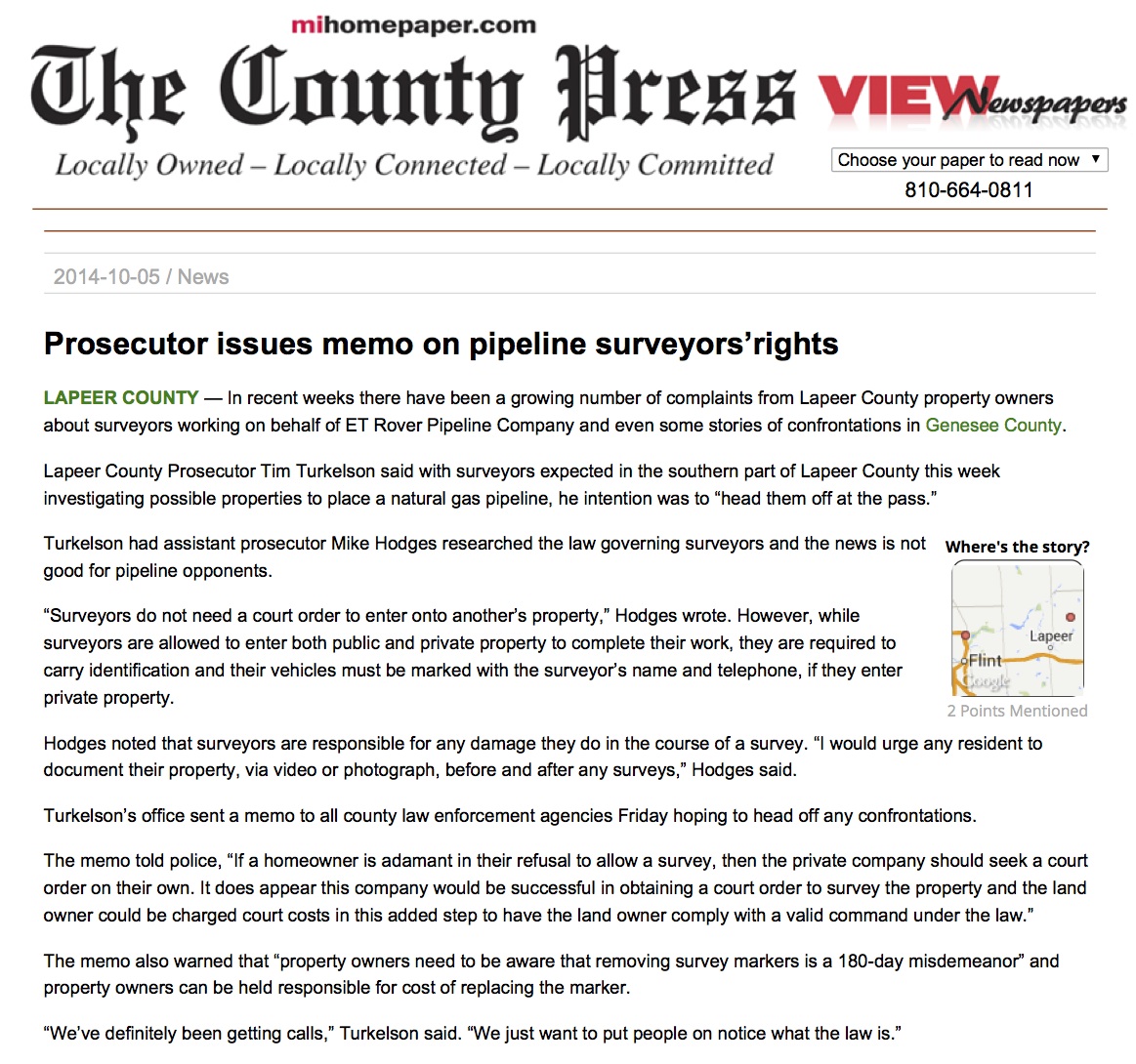 The latest instance of this failure of leadership in Michigan comes from Lapeer County Prosecutor Tim Turkelson who has apparently decided to weigh in on the thorny survey question that has been the source of controversy over the past couple of weeks. According to the Lapeer County Press (see the image at right), Turkelson this week issued a memo to county law enforcement supporting ET Rover’s right to survey without landowner permission. Why? Well, Turkelson apparently assigned his assistant prosecutor Mike Hodges the task of looking into the matter and Hodges went and generated what we believe is a serious misreading of the law, which Turkelson appears to accept.