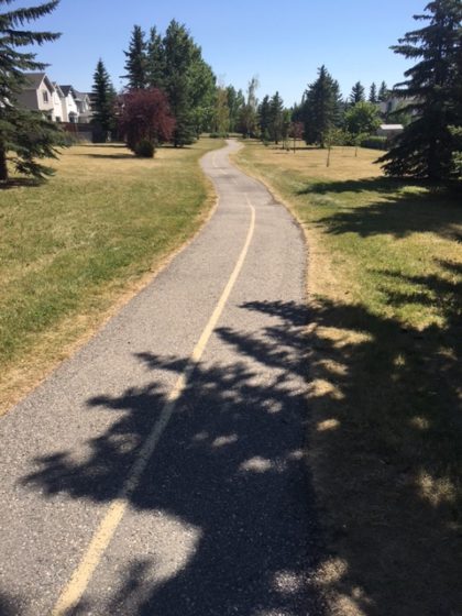 I cut down side streets and through alleys until I reach one of the redeeming features of these newer suburbs, which is a network of snaking bike and walking paths that lead to the Bow or Elbow River. The path closest to my mother’s home is in a long green space that takes the place of some of the alleyways. There isn’t much to it—a small playground here, small trees plopped down there—and normally I hurry through these spaces until I can reach the river. Today, I slow down, drawn to the backyards I pass by.
